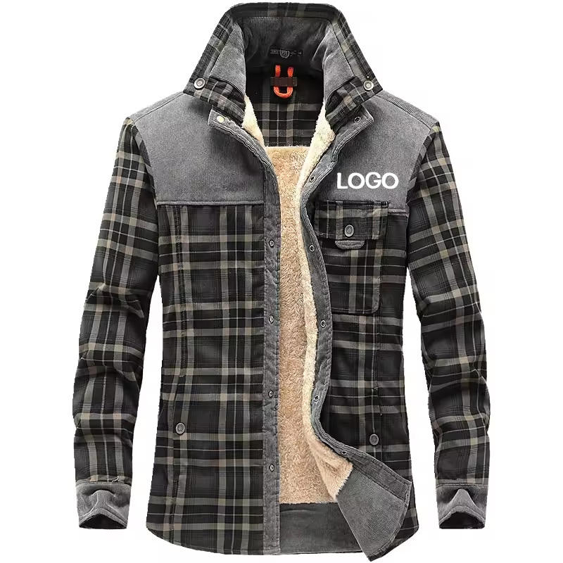 Chemise à carreaux décontractée à manches longues en peluche chaude d'hiver avec logo personnalisé, col à revers et empiècements pour hommes – Vente en gros usine