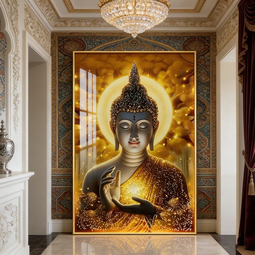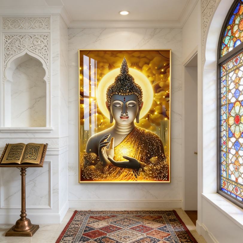 Vente en gros d'usine, statue de Bouddha dorée islamique personnalisée imprimée en HD pour salon, peinture en porcelaine cristalline, décoration intérieure LED