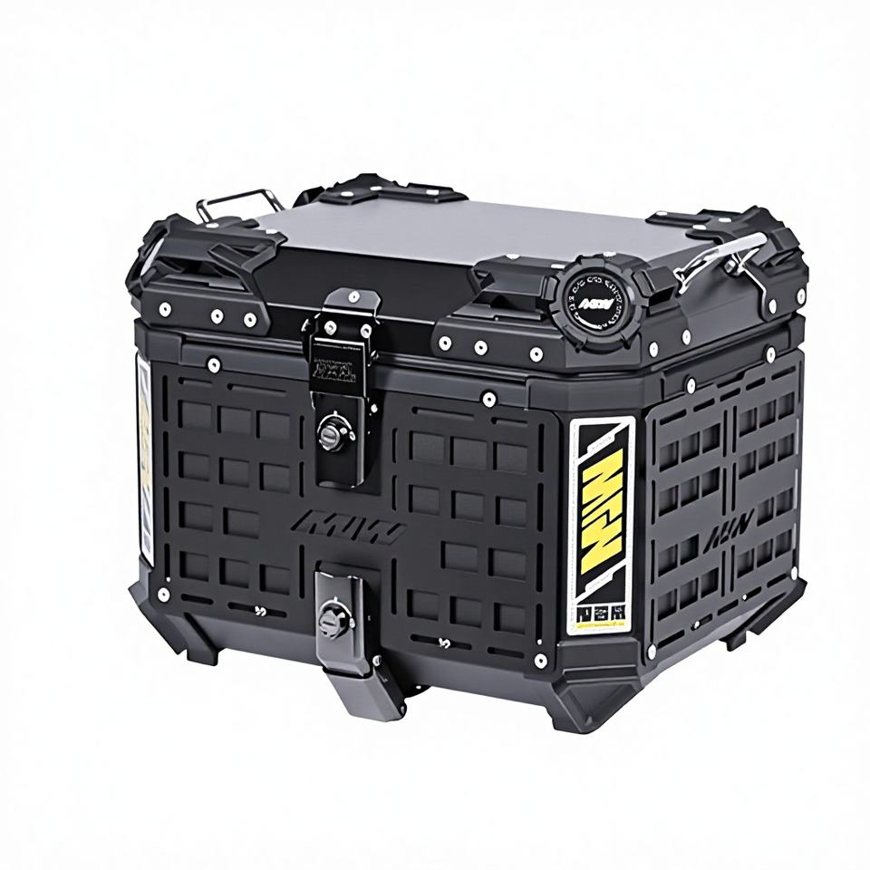 Vente en gros d'usine, coffre arrière de moto universel en alliage d'aluminium de grande capacité 45L, anti-chute, pour tout-terrain