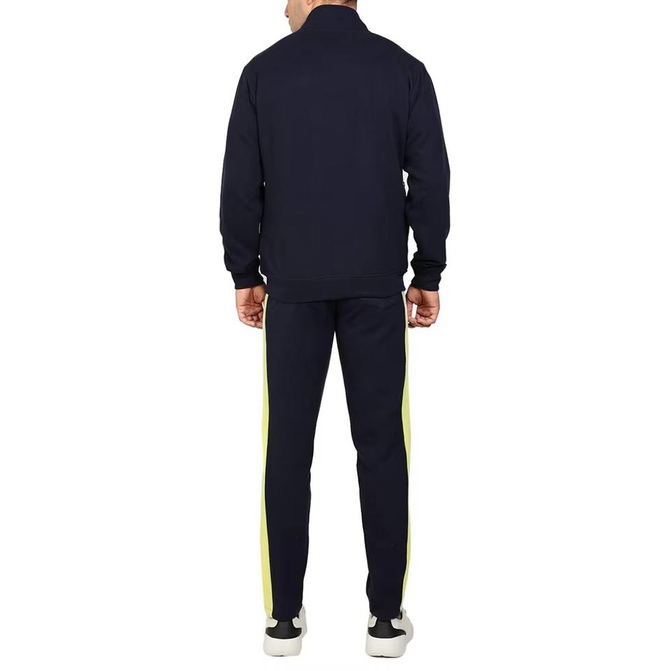 Ensemble de survêtement bleu marine pour hommes, vente en gros d'usine, veste à fermeture éclair intégrale et pantalon à rayures jaunes et blanches, tenue de sport deux pièces pour la gym