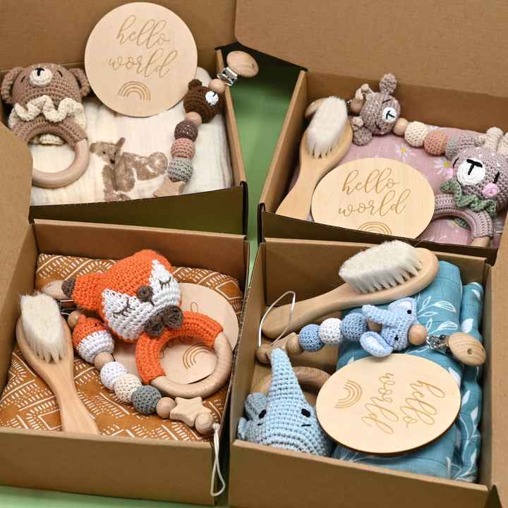 Vente en gros d'usine/OEM, hochets en crochet pour bébé, ensemble en bois, boîte cadeau de naissance, chaîne de sucette, cadeau de premier mois de bébé