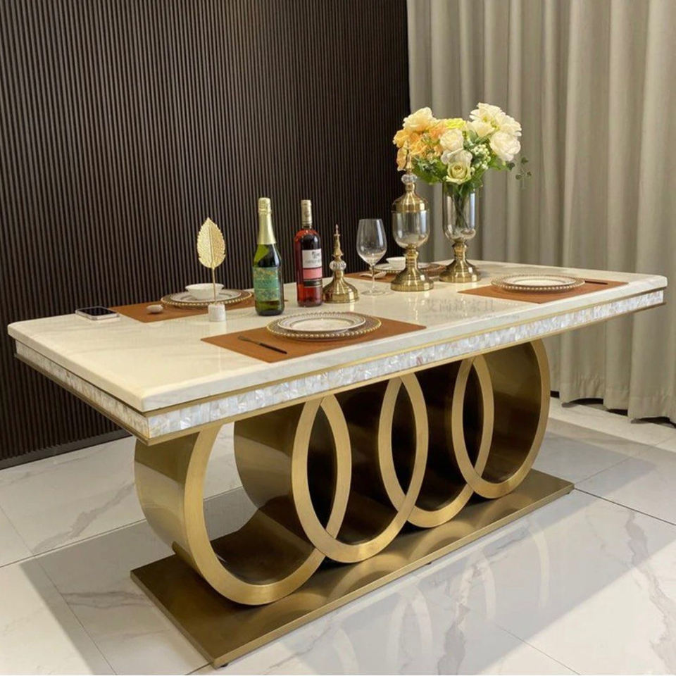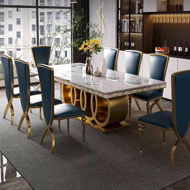 Table à manger rectangulaire en acier inoxydable doré de style moderne, prix de gros d'usine, adaptée à 6 chaises
