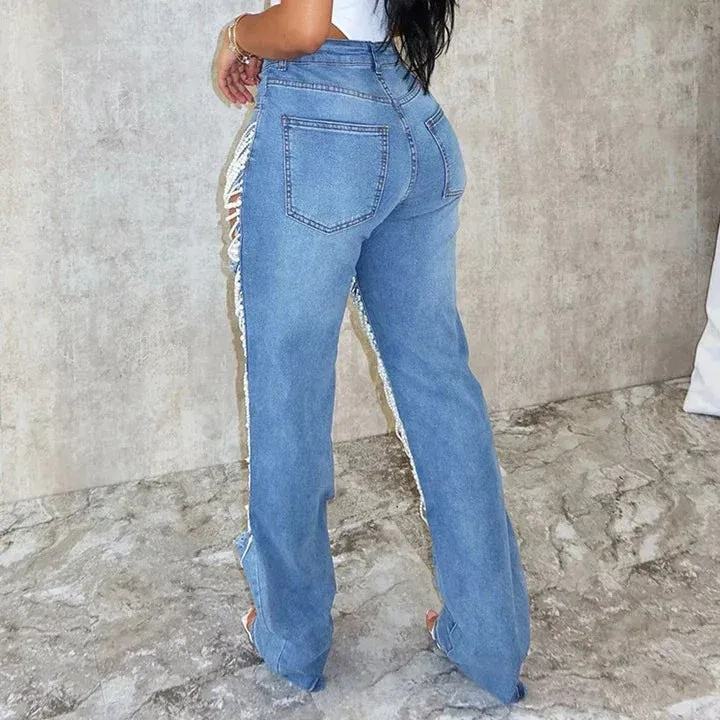 Jeans en denim déchirés et délavés pour hommes, coupe droite slim, imprimé vague d'eau, super superposés, collection automne-été, vente en gros usine