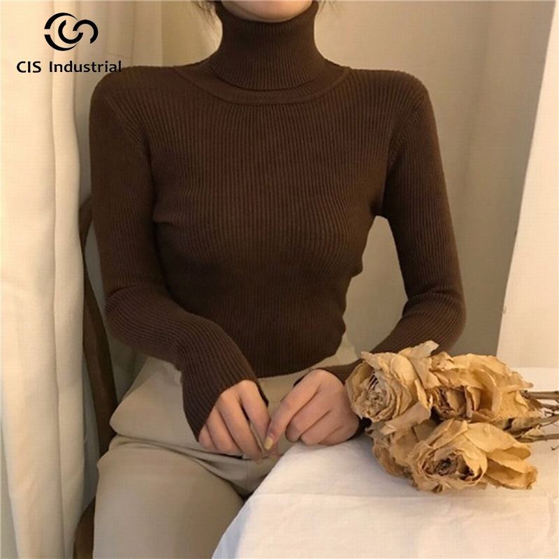 Usine en gros printemps automne hiver chaud hauts tricotés pull côtelé tricots pull à col roulé de haute qualité pour les femmes