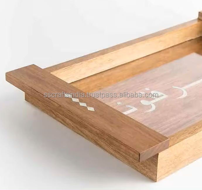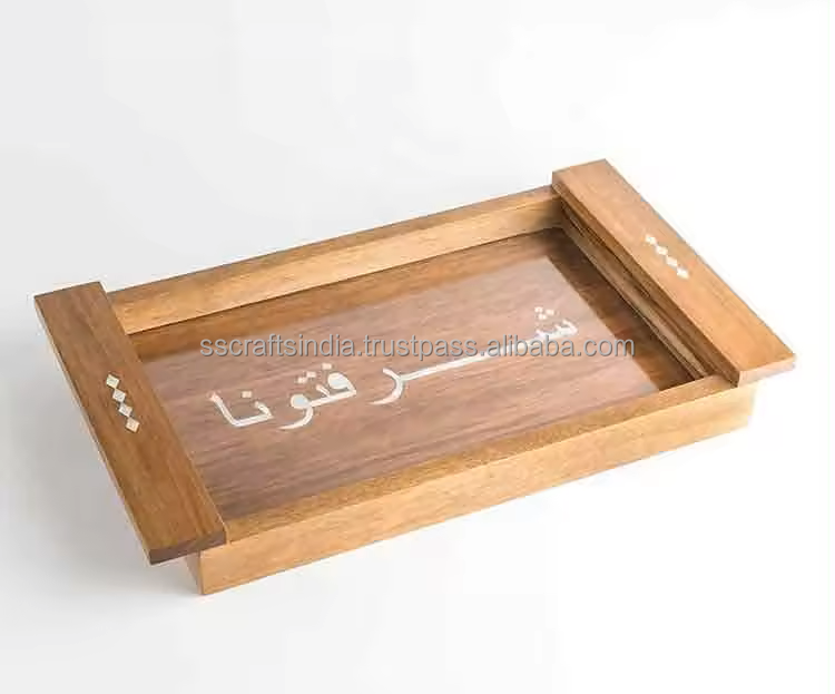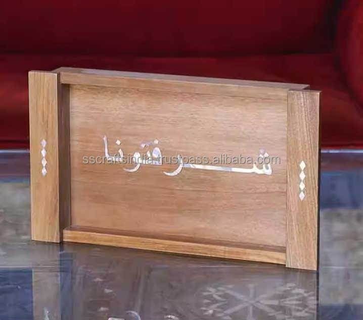 Vente en gros d'usine Plateau rectangulaire en bois fait à la main avec incrustation de nacre arabe Plateau de présentation de chocolat Plateau de service Cadeaux de Ramadan Eid
