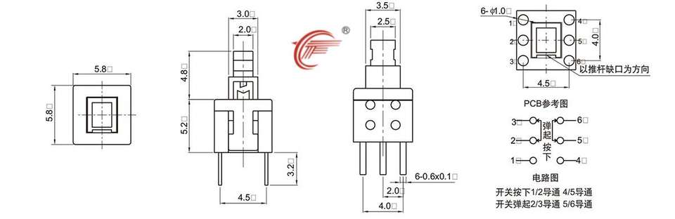 Vente directe d'usine, interrupteur à poussoir personnalisable, 6 broches, 5,8*5,8 avec boucle de verrouillage, 250g, PPA, résistant aux hautes températures, RoHS