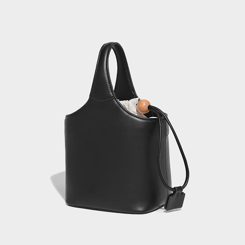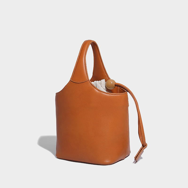 Factory direct wholesale caramel leather bucket bag with wooden beads for a simple and casual look