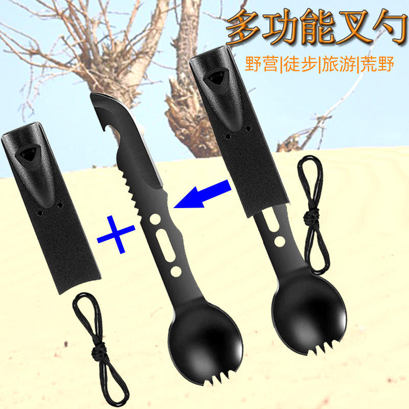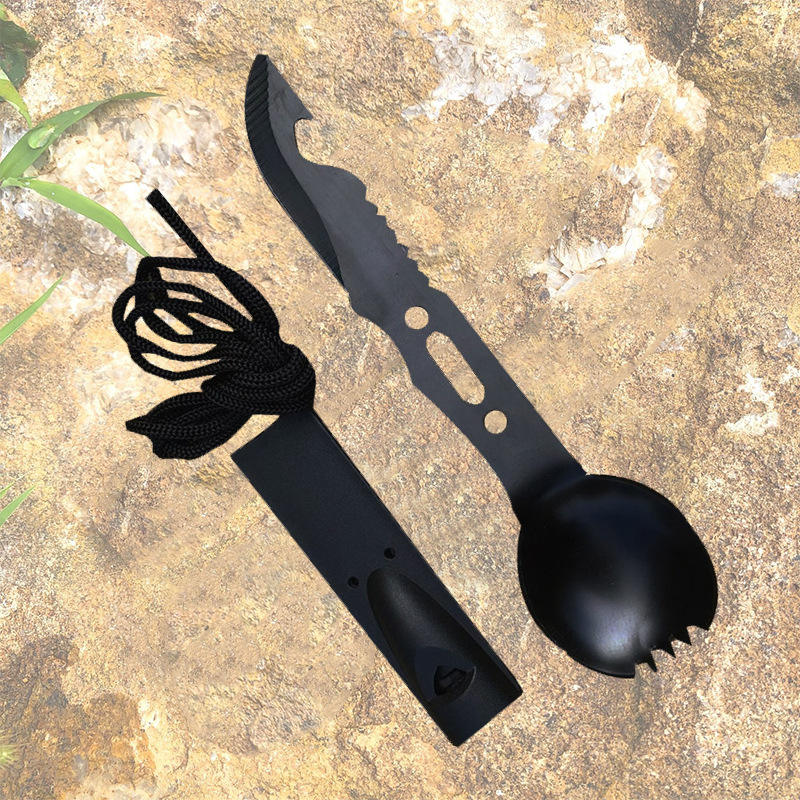 Outil multifonction de survie Fak en acier inoxydable, cuillère-fourchette à dents partiellement dentelées avec ouvre-bouteille pour le camping et les activités de plein air