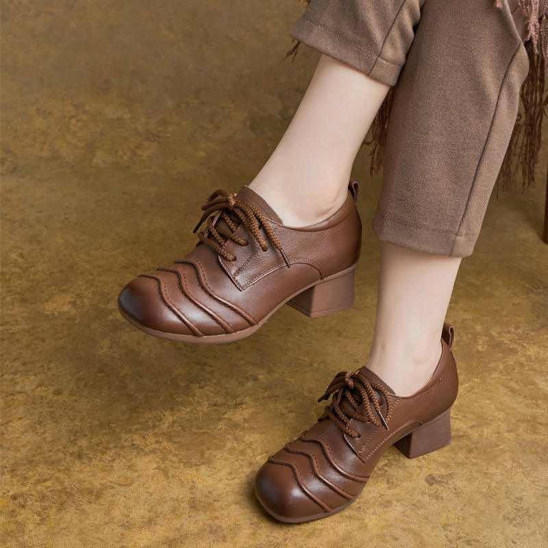 Chaussures en cuir à talon carré confortables et confortables pour femme, style britannique, bout rond, à lacets, à talon haut, à bout souple