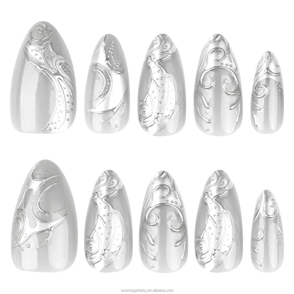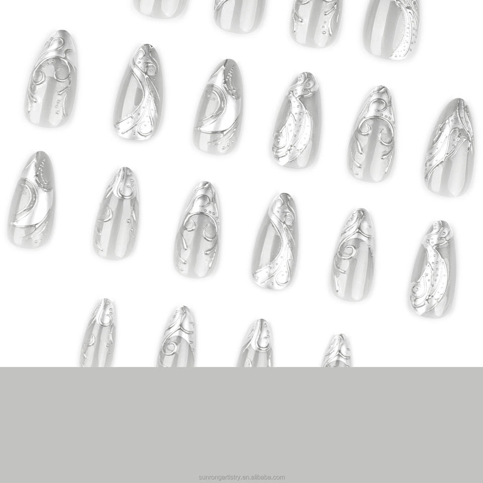 Faux ongles en amande courte, style français argenté, avec pâte argentée 3D, à presser, ongles artificiels