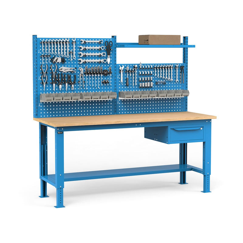 Établi réglable Fami WORK2036, 200cm, plateau en bois, tiroir et mur perforé