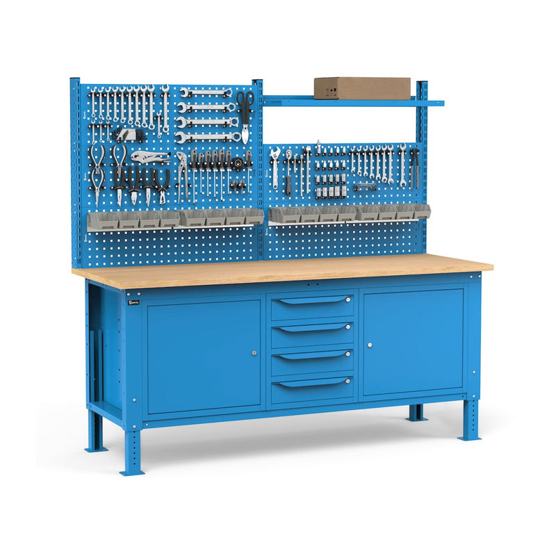 Établi réglable Fami WORK2041, 200cm, plateau en bois, 4 tiroirs, 2 armoires et mur perforé