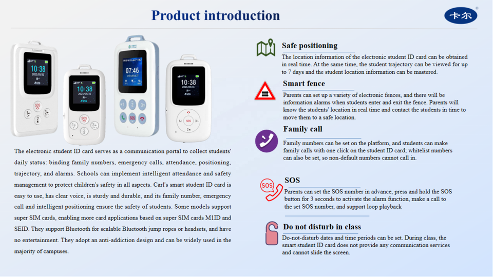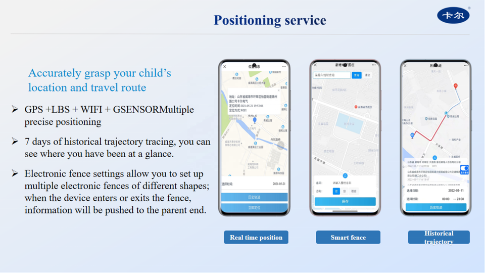 SOS/Appel familial, Positionnement, Historique de suivi, Liste blanche, SMS, Alarme