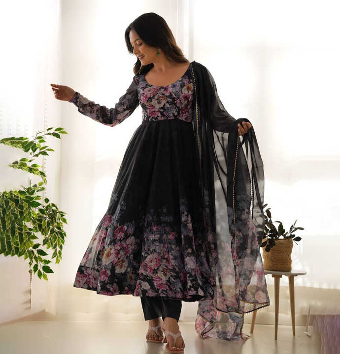Anarkali de créateur noir élégant en organza Tabhi avec imprimé numérique, Pishwas indien pour femme avec dupatta, prêt-à-porter