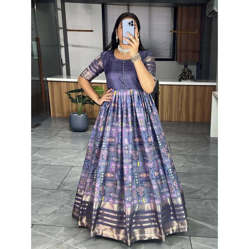 Fancy Cotton Silk Floral Print Gown with Weaving Border in Violet
