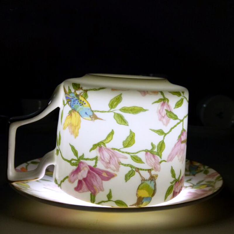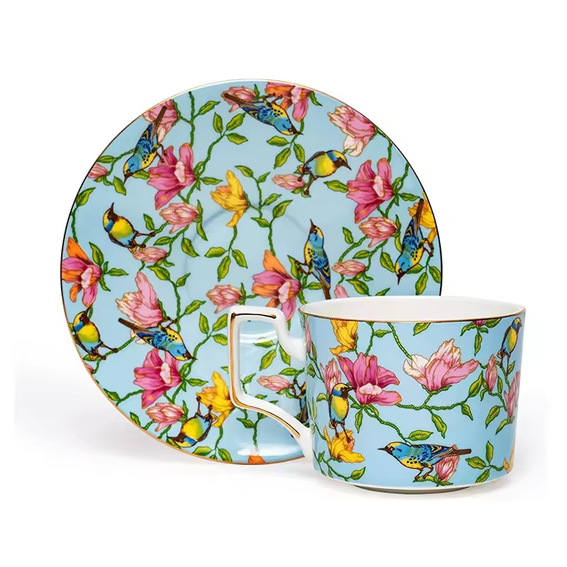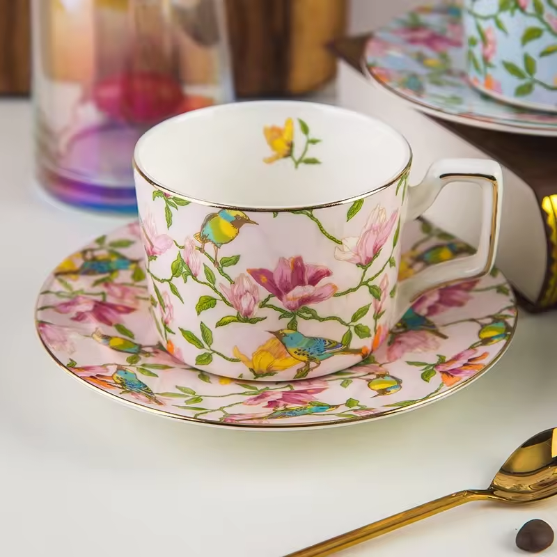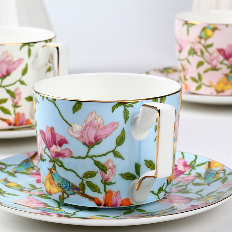 Fantaisie Design Décalque Imprimé Fleur De Luxe Écologique Sans BPA Porcelaine Tasses À Thé et Soucoupes Ensemble avec Jante En Or