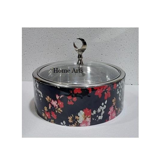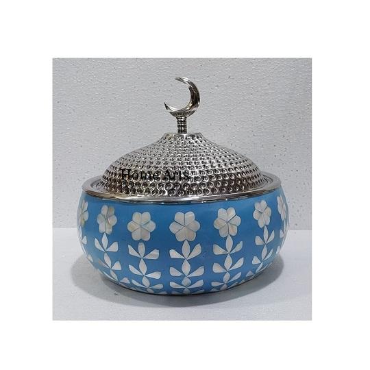 Marmite de service ronde au design élégant en bois et nacre avec couvercle martelé en acier inoxydable, idéale pour la vente en gros