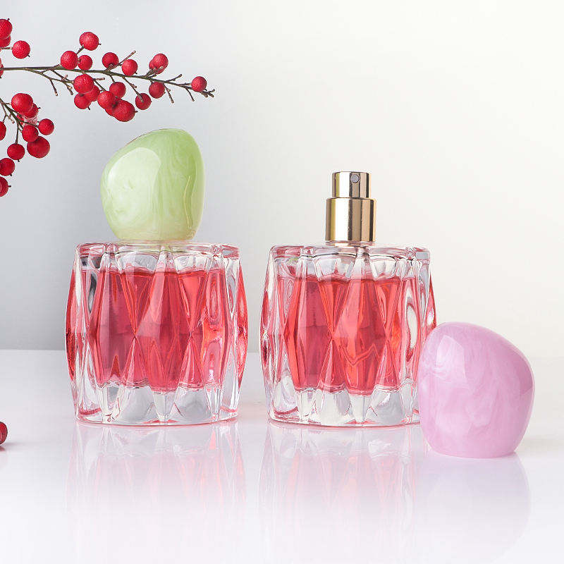 Flacon de parfum en verre rond transparent de 50 ml avec embout vaporisateur à sertir de 15 mm et capuchon en résine rose-vert, motif gaufré fantaisie
