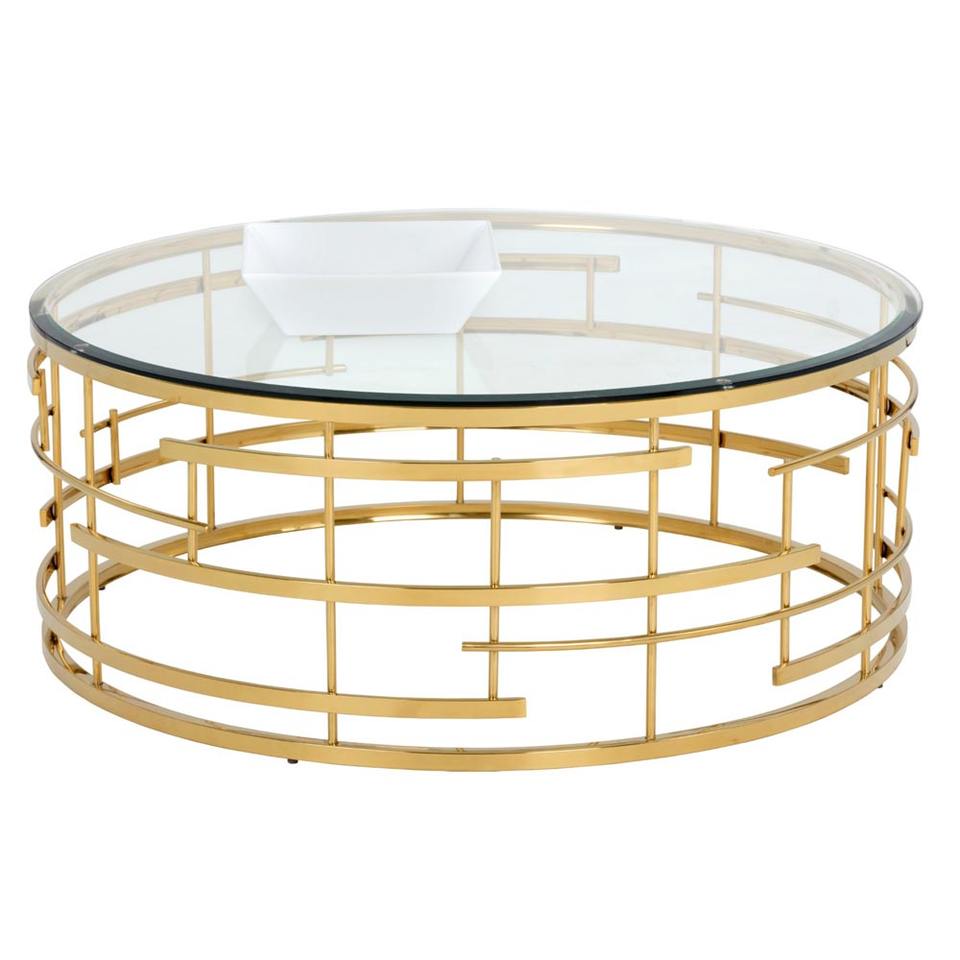 Table basse géométrique fantaisie en métal doré avec dessus en verre sur Offre Spéciale