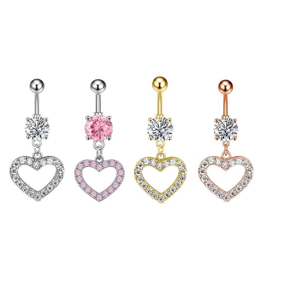 Anneau de nombril en zircon en forme de cœur creux, vente chaude, bijoux de corps en acier inoxydable, plaqué or, barre de 10 mm, piercing de nombril