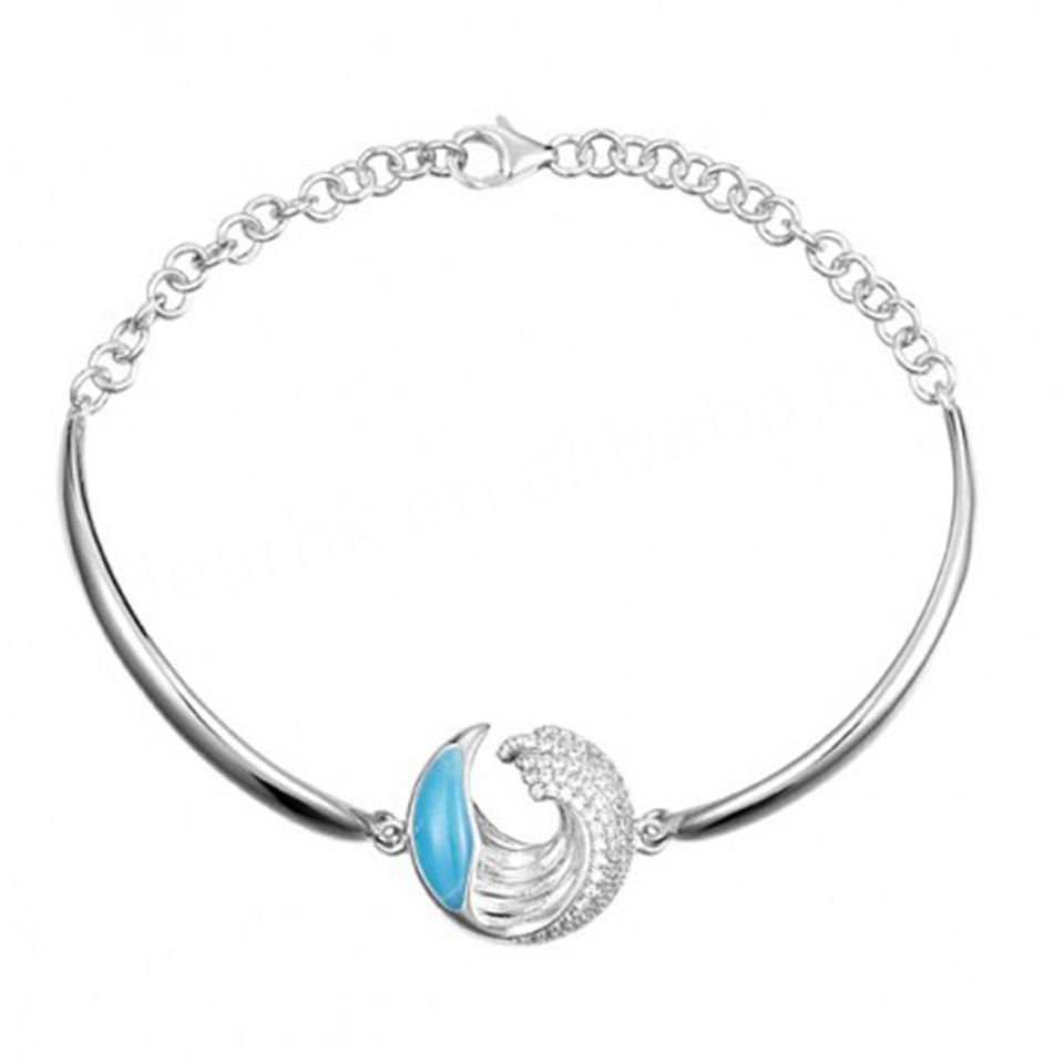 Bracelet fantaisie pour femmes, style hawaïen, en argent 925, pierre précieuse larimar, fleur, plaqué rhodium, pour les fêtes et les cadeaux