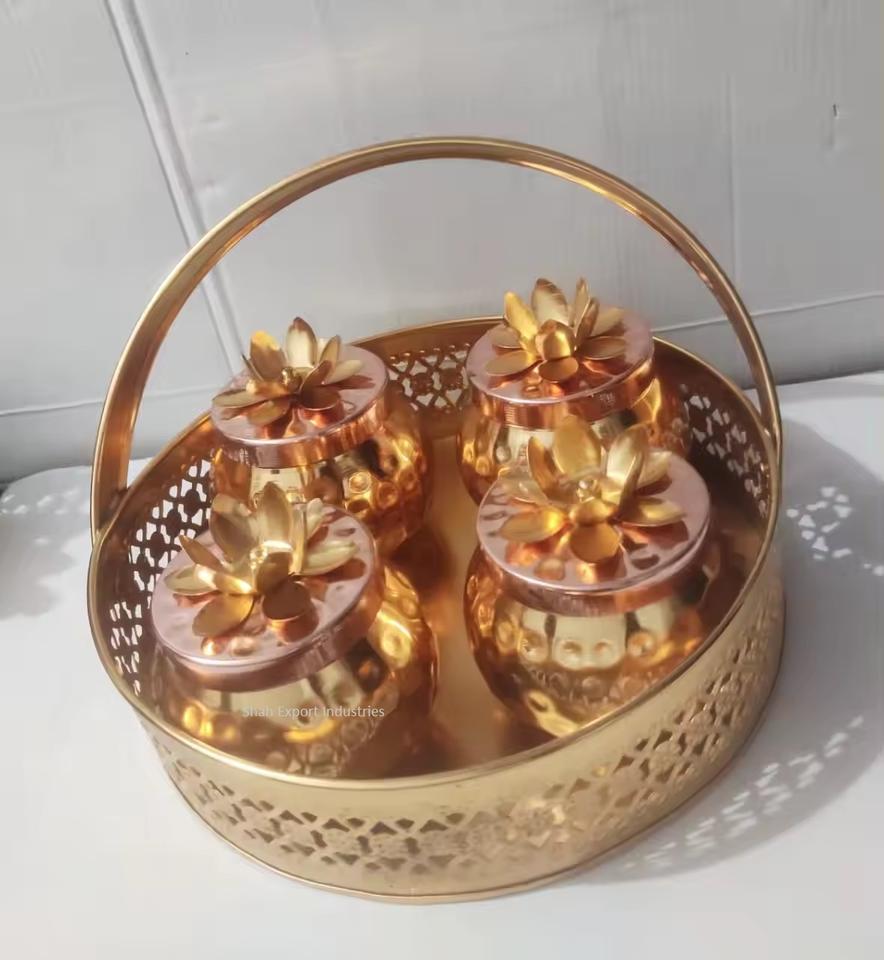 Panier de pot de fruits secs martelé en cuivre en métal fantaisie avec couvercle de bouton de fleur d'or pour le panier de panier doué de mariage