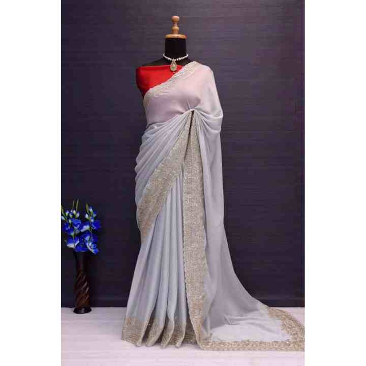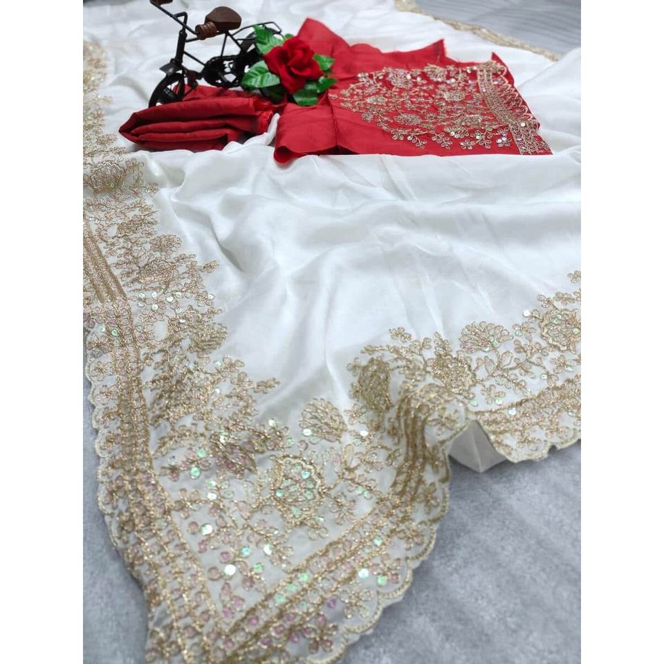 Saree fantaisie en soie brodée Rangoli avec chemisier en soie 100% non cousu couleur blanche
