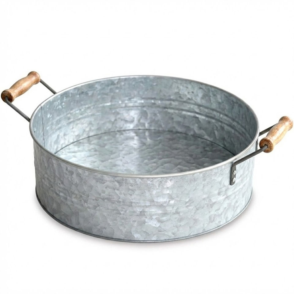 Plateau de service rond en métal galvanisé avec poignées en bois, centre de table décoratif en acier pour la cuisine, la décoration de la maison et les fêtes