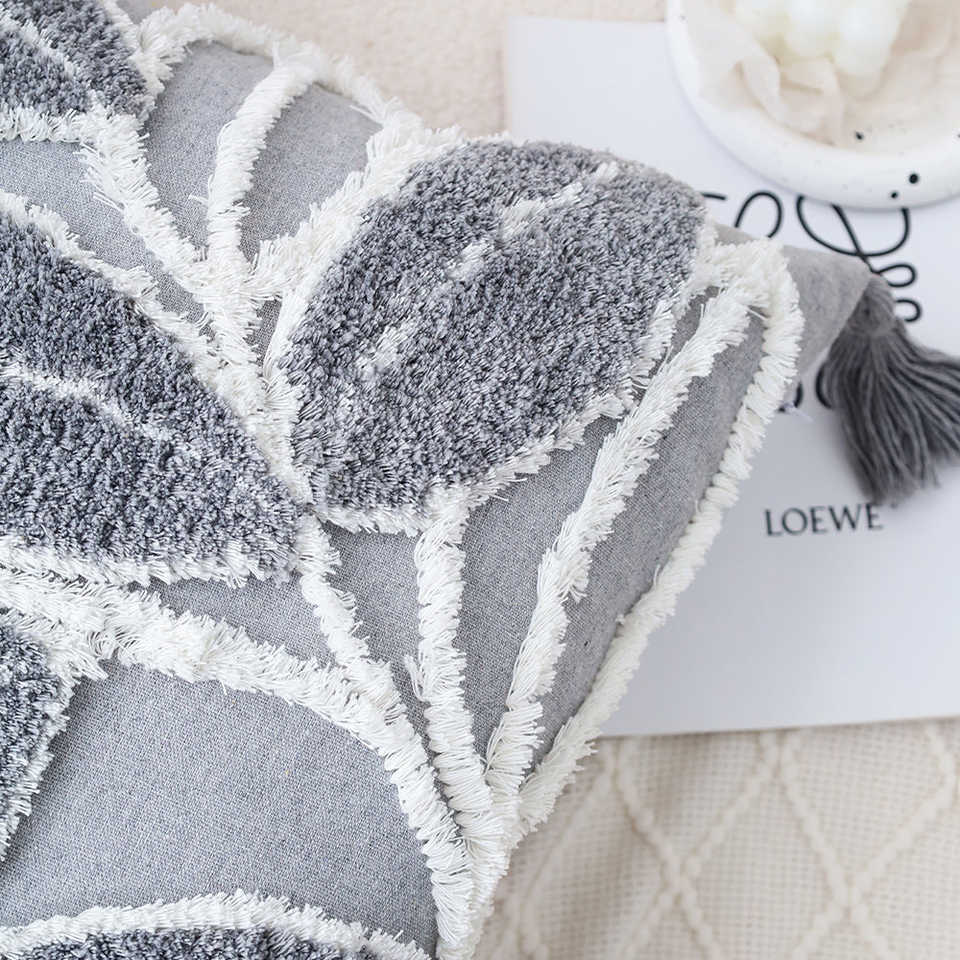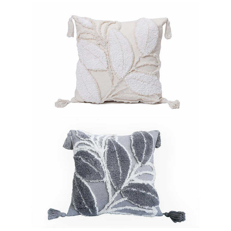 Coussin décoratif fantaisie et bohème Fancy & Stacy, motif floral tufté, 18x18, en coton, avec fermeture éclair amovible, beige, avec pompons