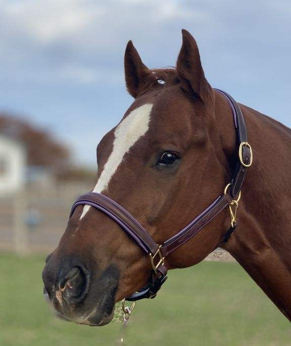 Halter cousu fantaisie avec rembourrage violet. Avec couronne en laiton et pièces de joues plates ajoutées