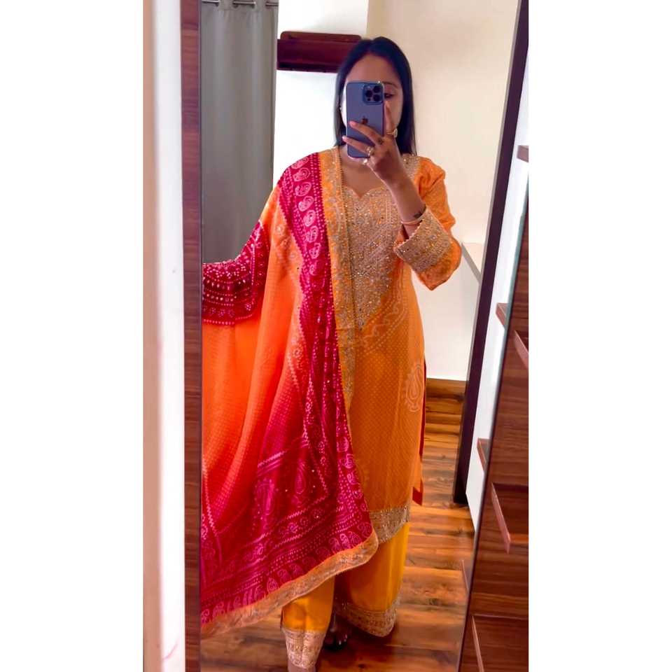 Ensemble fantaisie haut-bas et Dupatta avec impression numérique et séquence de broderie taille XL