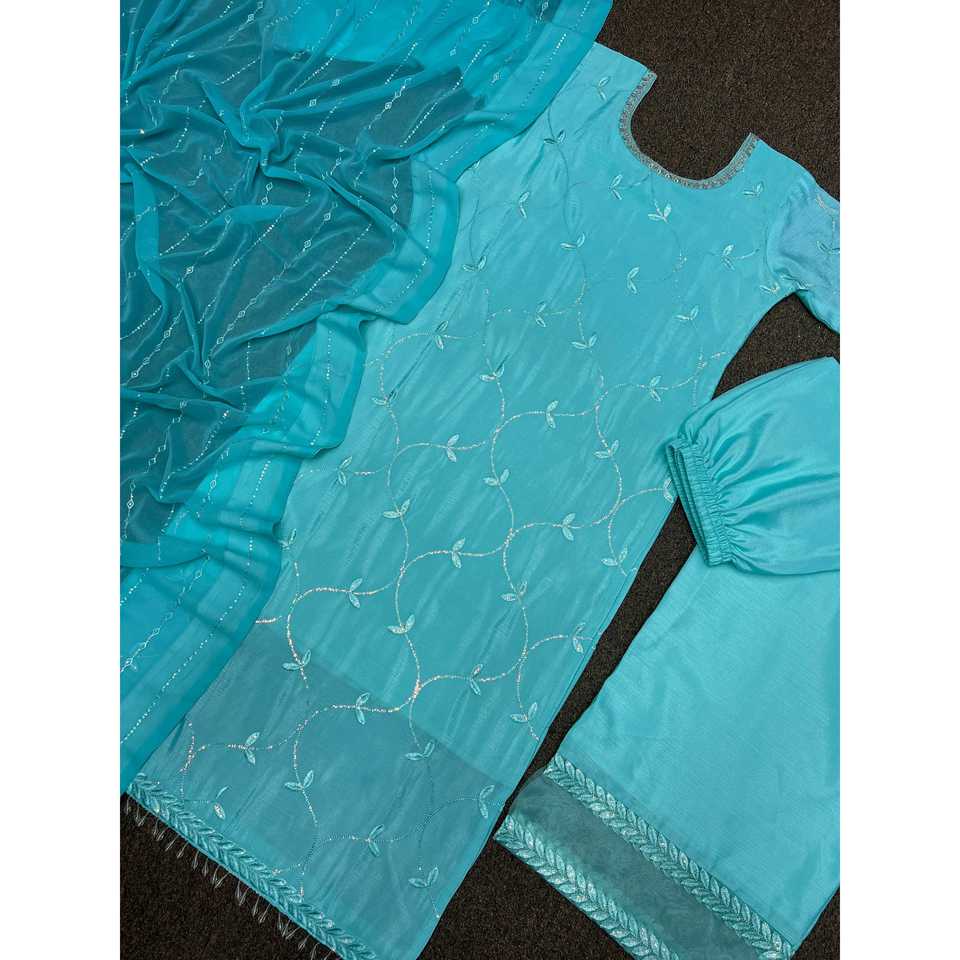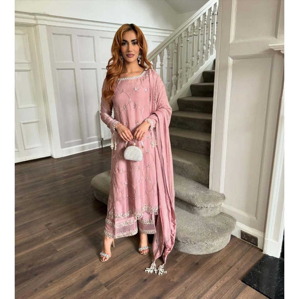 Ensemble haut-pantalon palazzo élégant avec de magnifiques broderies et des paillettes, en tissu mousseline, et dupatta inclus