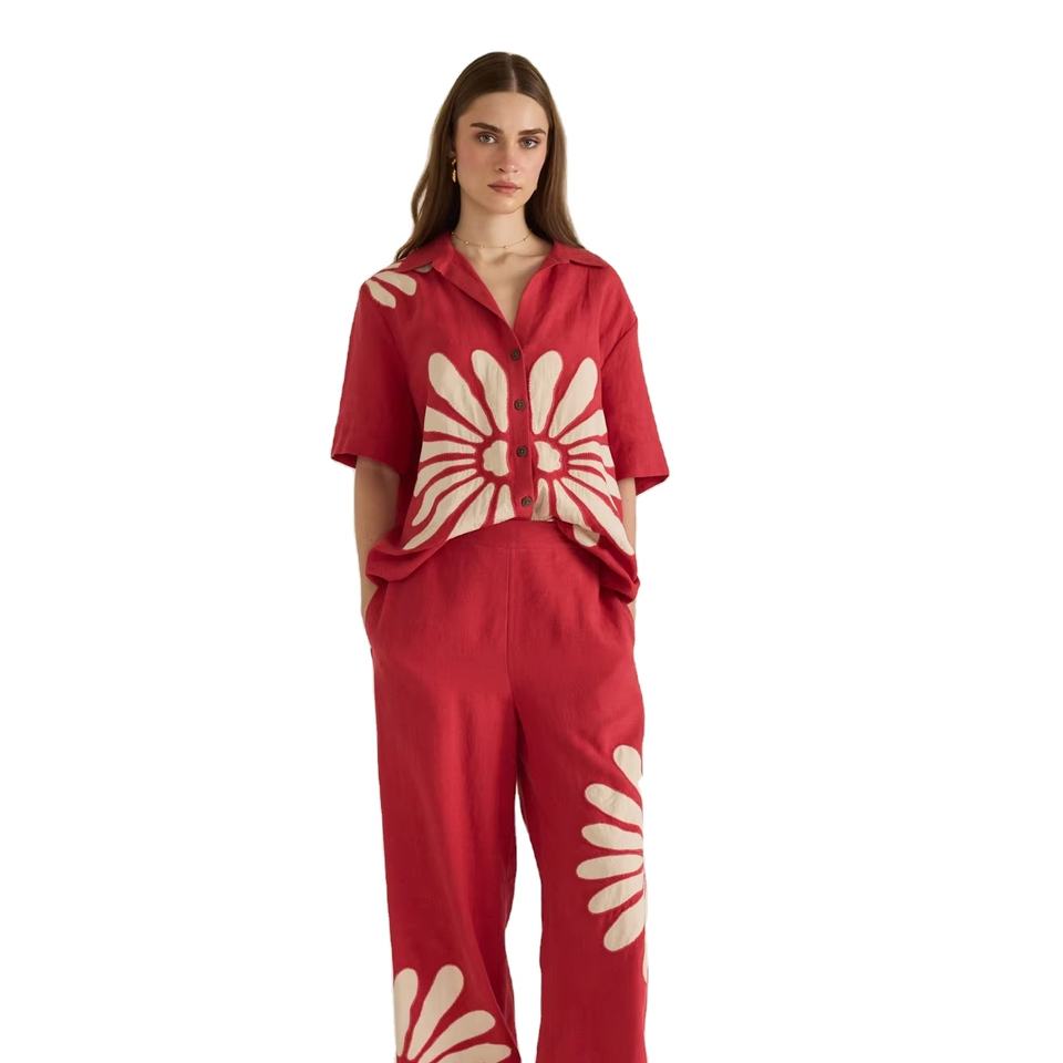 Ensemble de cordon rouge fantaisie pour femmes avec impression personnalisée Tenue de salon 2 pièces Fournisseur en gros B2B Ensembles de cordon d'impression personnalisée pour boutiques