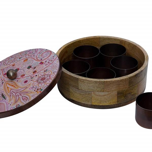Fantastique boîte à épices en bois de conception faite à la main forme ronde imprimé boîte masala en bois avec 7 compartiments et couvercle en métal