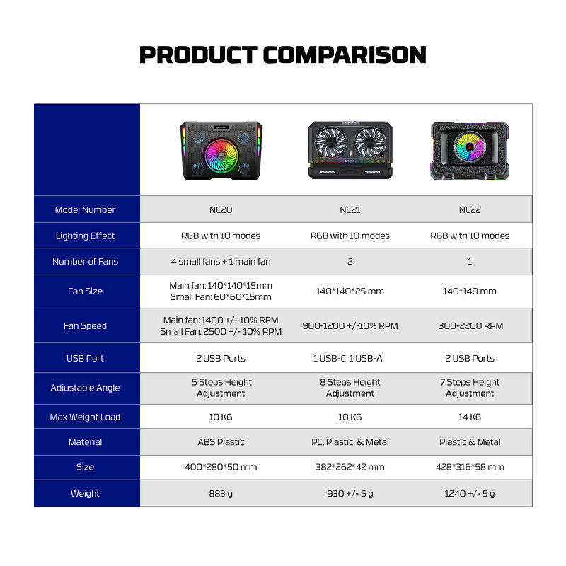 Fantech NC22 prend en charge le coussin en mousse magnétique du ventilateur 19 pouces RPM RGB LED 7 niveaux réglage de la hauteur refroidisseur pour ordinateur portable