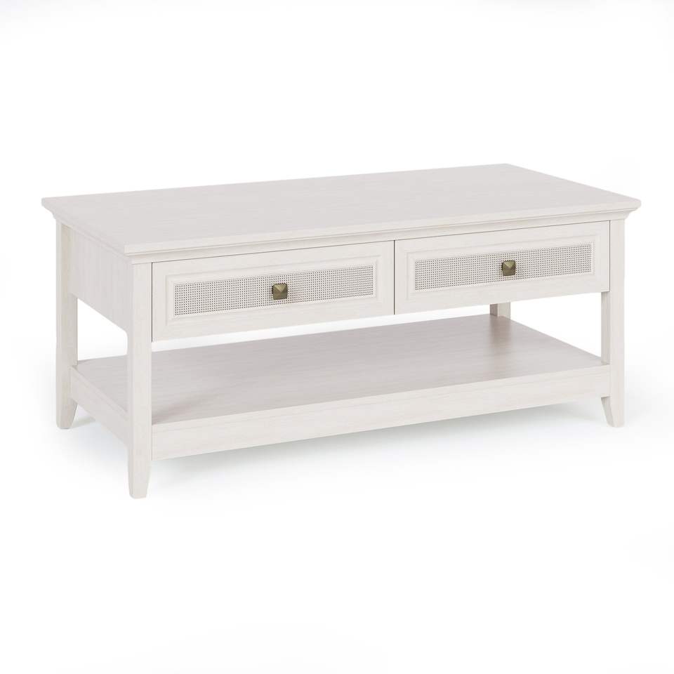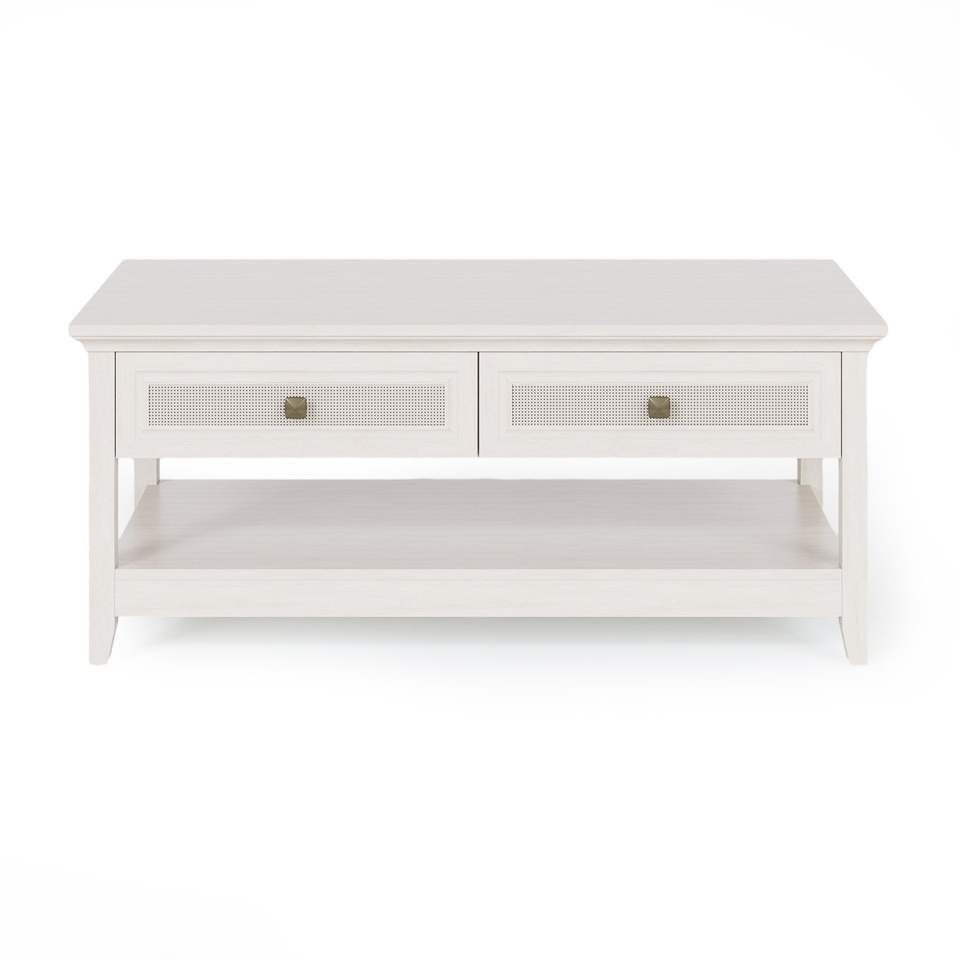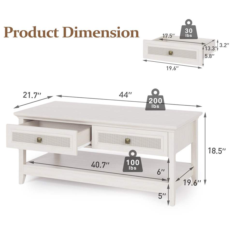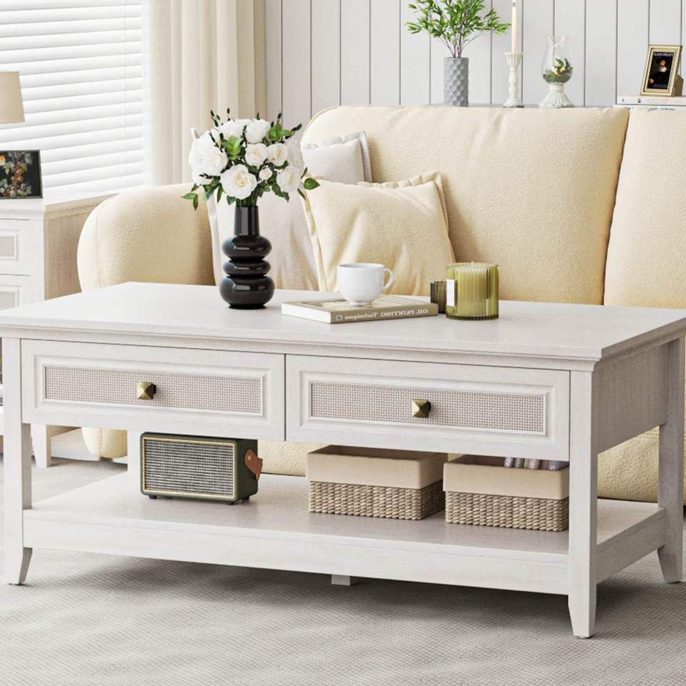 Table basse de style farmhouse à 2 niveaux avec table à thé thème bohème, 2 tiroirs décoratifs en rotin, table d'appoint pour canapé avec étagère de rangement