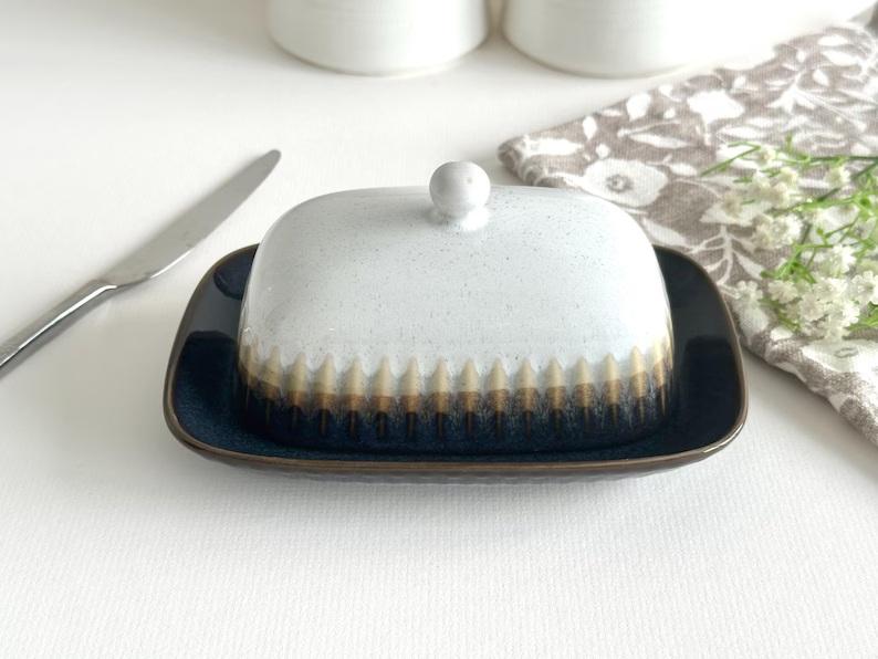 Pot à beurre style ferme avec couvercle à poignée arquée, finition émaillée mouchetée, plateau de service profond, solution élégante de rangement pour le beurre de cuisine