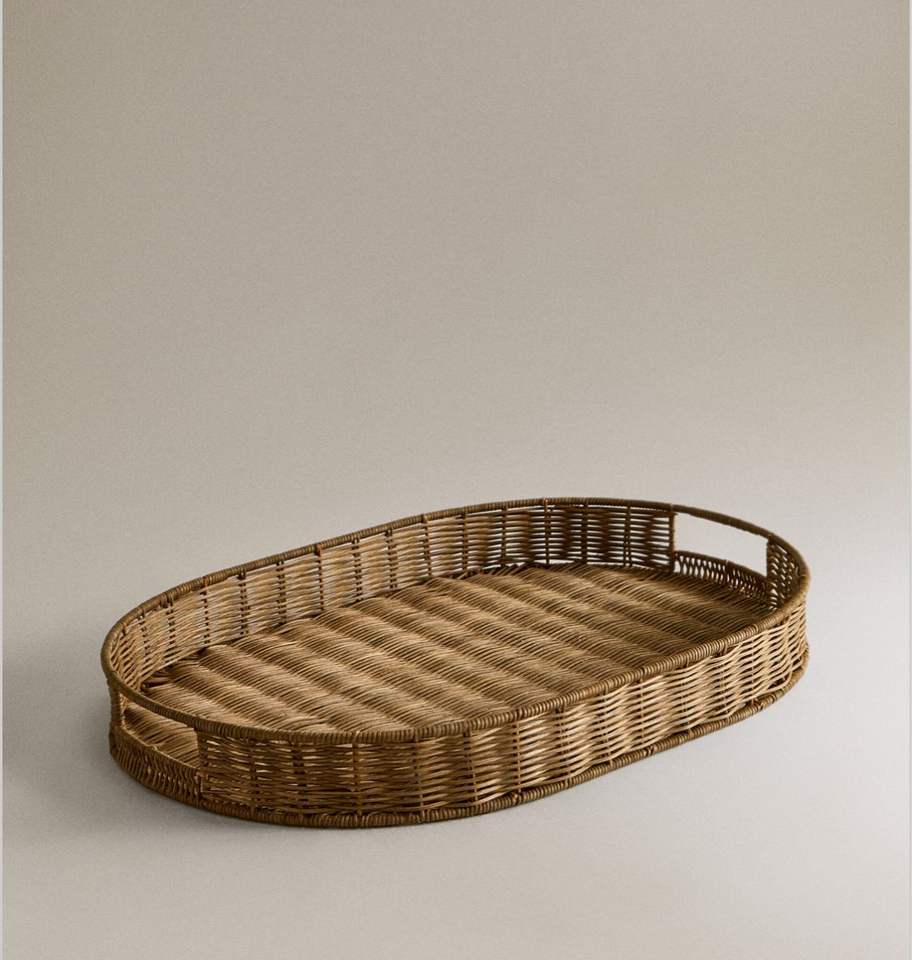 Plateau de service en rotin de style ferme avec aspect texturé utilisé dans le cadre de la table saisonnière et l'organisation minimale de la maison