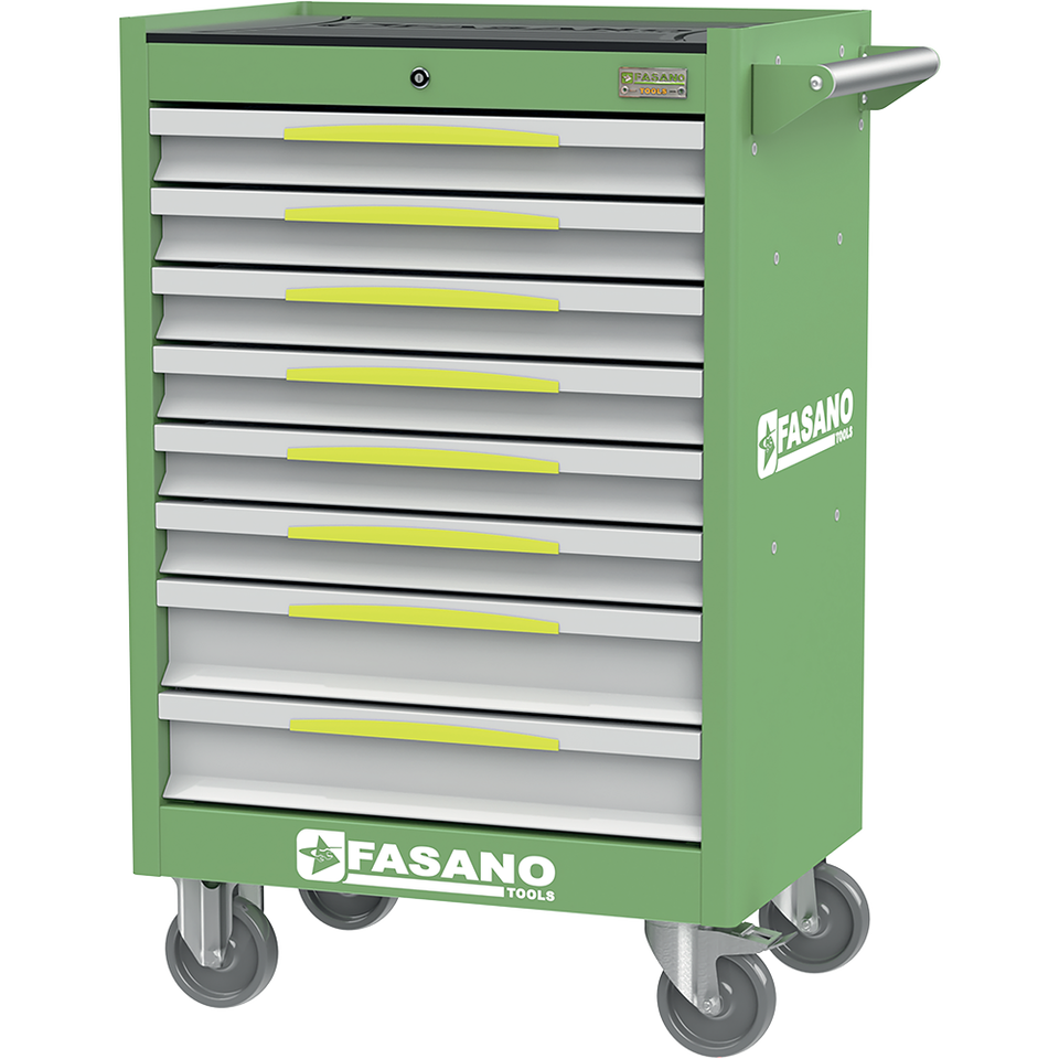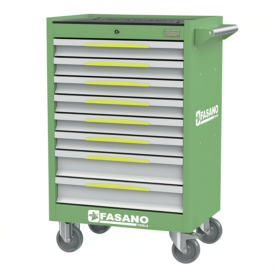 Chariot à outils roulant Fasano Tools à 10 tiroirs, armoire en acier vert avec roues pour le rangement en atelier