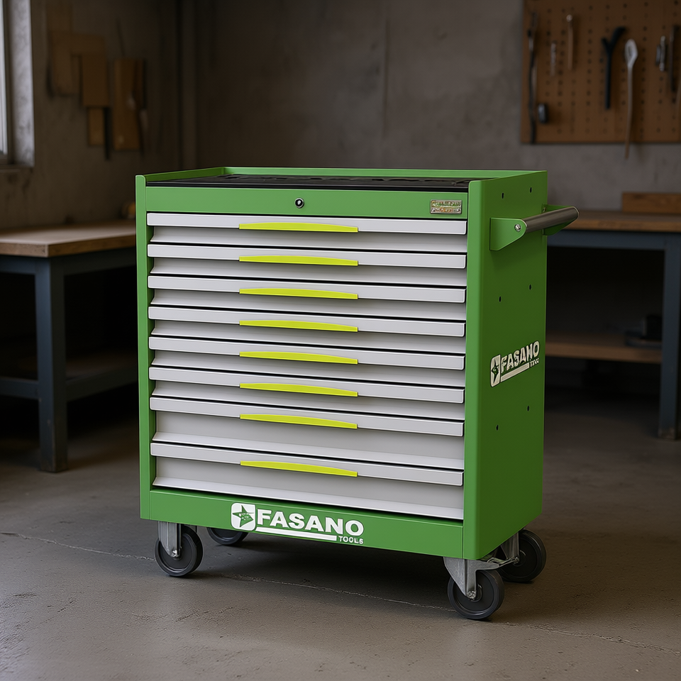 Armoire à outils roulante Fasano Tools à 7 tiroirs, verte, avec roulettes, pour le rangement en atelier