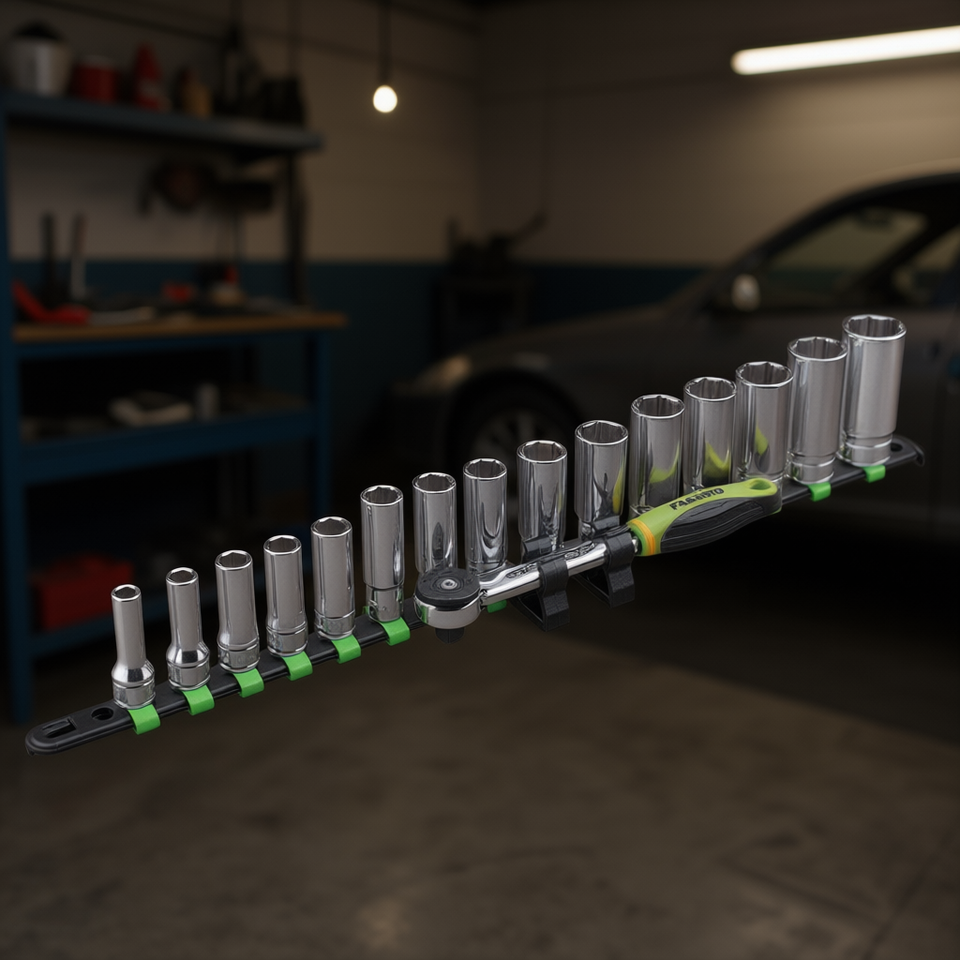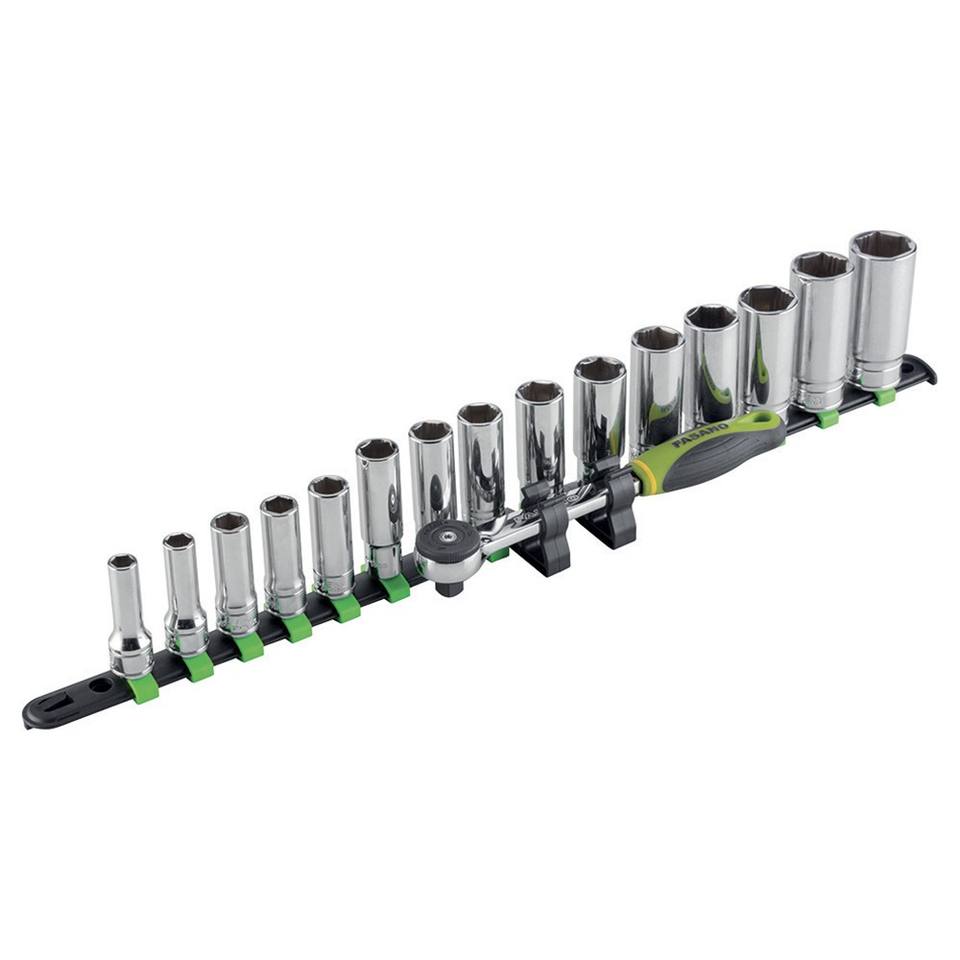 Jeu de douilles Fasario, 16 pièces, entraînement 1/4 pouce, métrique, en acier au chrome vanadium, avec cliquet et support d'organisation pour réparation automobile