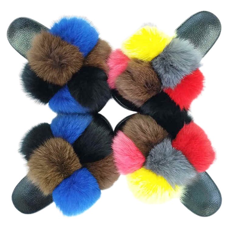 Mode couleur grande vraie boule de fourrure moelleuse Pom renard sandales raton laveur maman et enfants fourrure chaussures plates fourrure enfant en bas âge bébé enfants pantoufles de fourrure