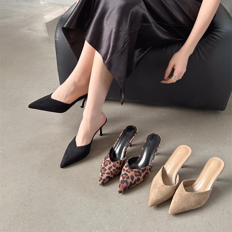 Fashion Custom Ladies Suede Leopard Slippers High Heels Slip on Pointed Closed Toe Daily Mules and Sandals for Women