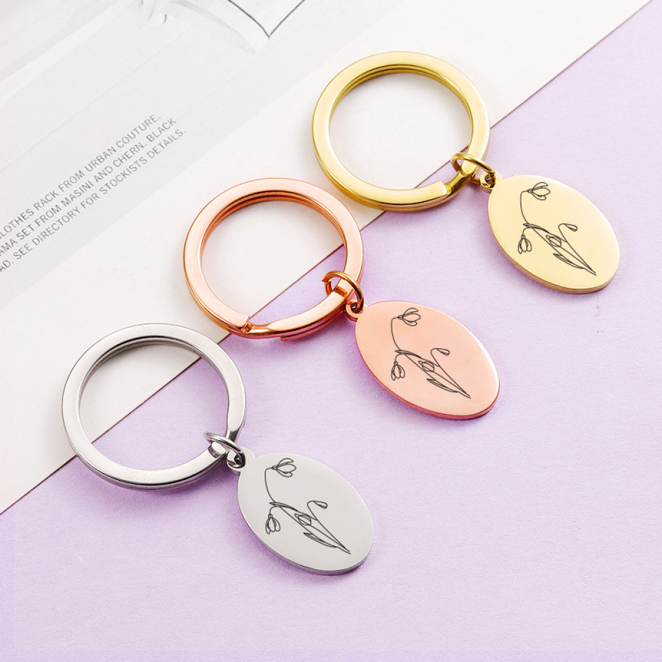 Mode personnalisé Mini porte-clés accessoires bijoux cadeau gravé naissance mois fleur en acier inoxydable porte-clés