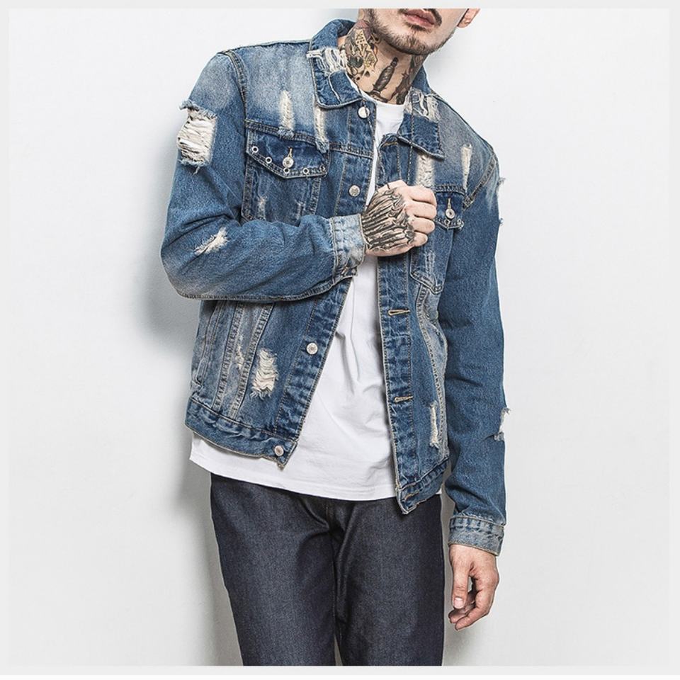 Veste en jean déchirée délavée bleue coupe ajustée à col rabattu grande taille pour homme – Style décontracté et tendance
