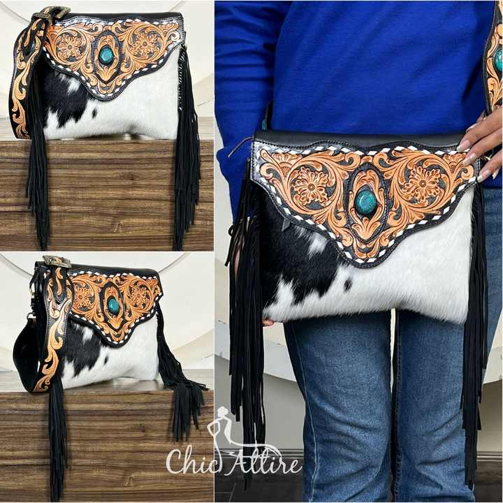 Sac bandoulière en cuir de vachette à franges, travaillé à la main