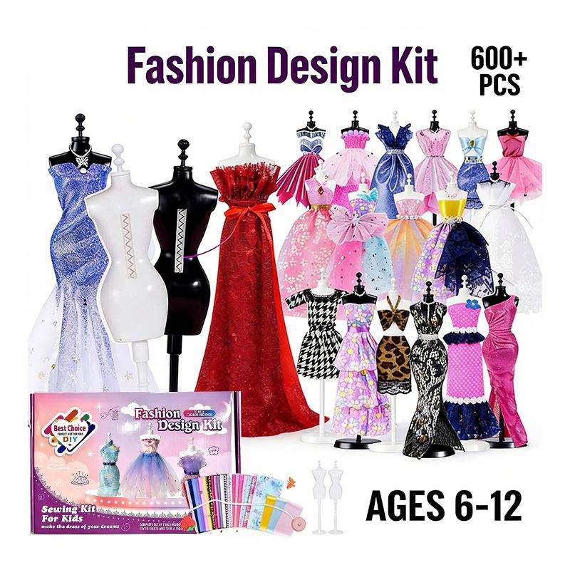 Kit de Conception de Mode pour Enfants : Mannequin en Plastique, Gabarits en Tissu, Accessoires et Outils de Couture Créative, Rangement Portable, Cadeau Idéal