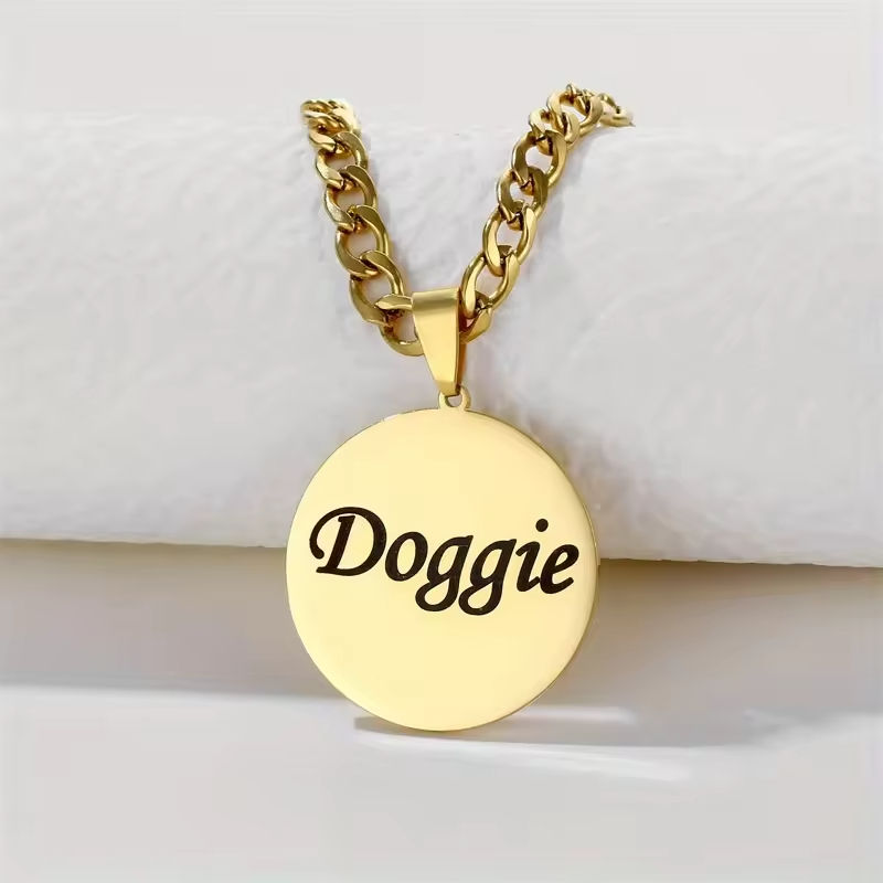 Bijoux de créateur de mode Or Texte personnalisé Logo Gravé Collier Nom de marque personnalisé Collier pendentif rond en acier inoxydable