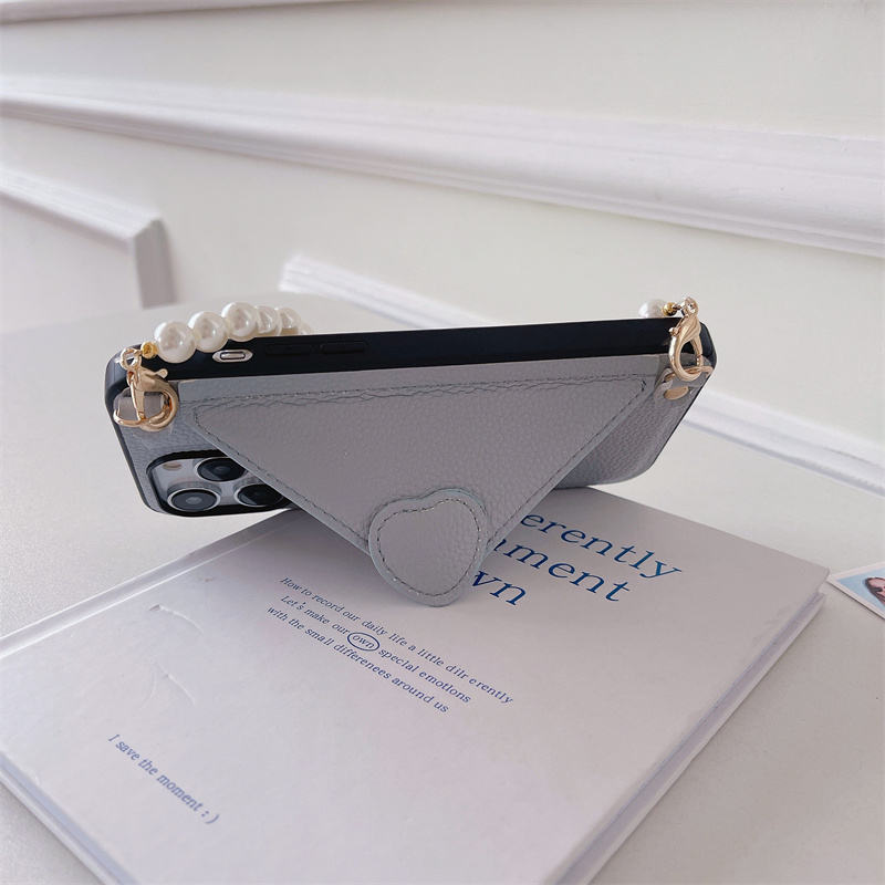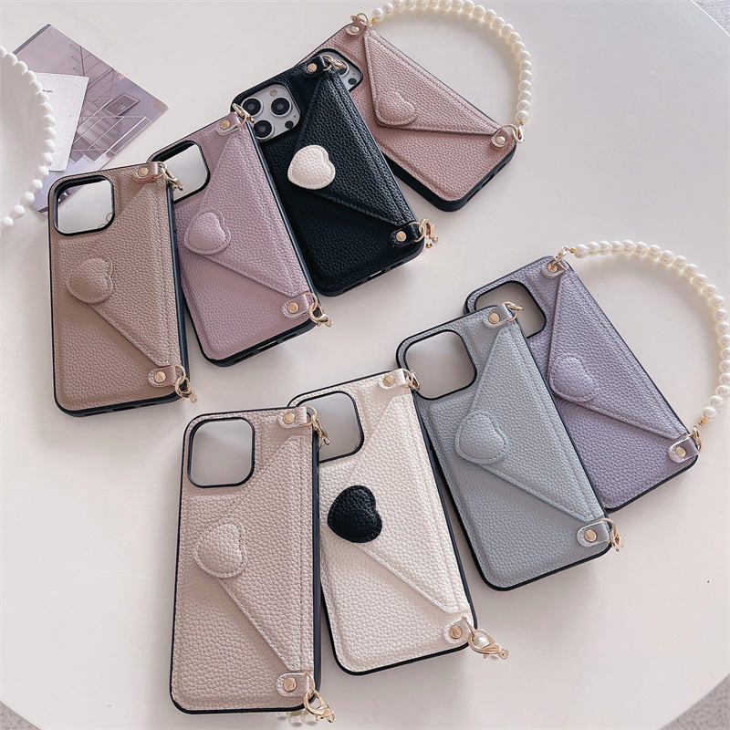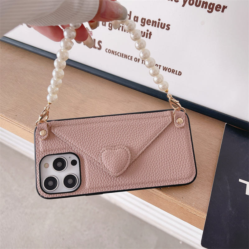 Porte-cartes en cuir de style fille à la mode pour iPhone 14 Pro 11 12 13 Pro Max Étui Chaîne de main en perles