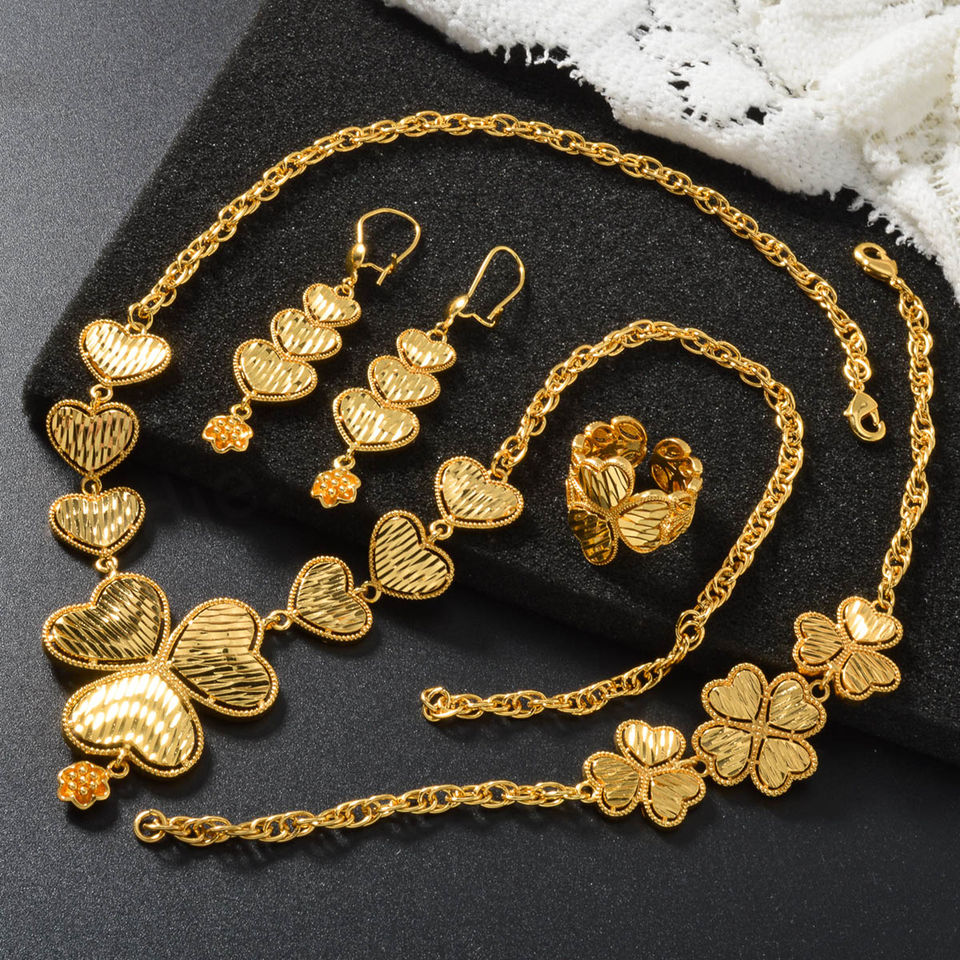 Ensemble de bijoux fantaisie plaqué or 18 carats en cuivre, collier, bracelet, bague, boucles d'oreilles en forme de cœur